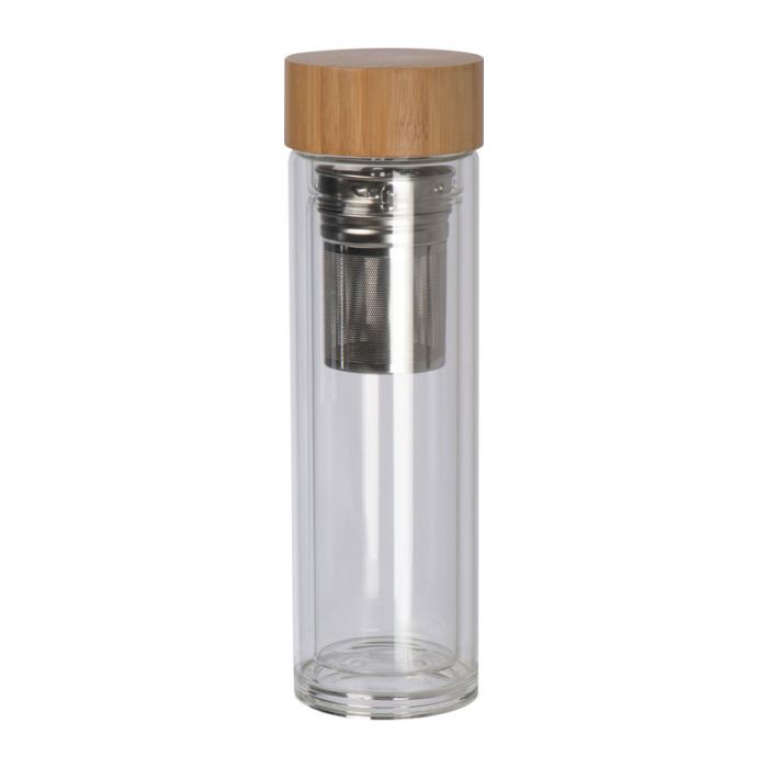 Sticlă cu perete dublu, vacuum între pereţi, cu sită detașabilă pentru ceai sau fructe, capacitate de 420ml.