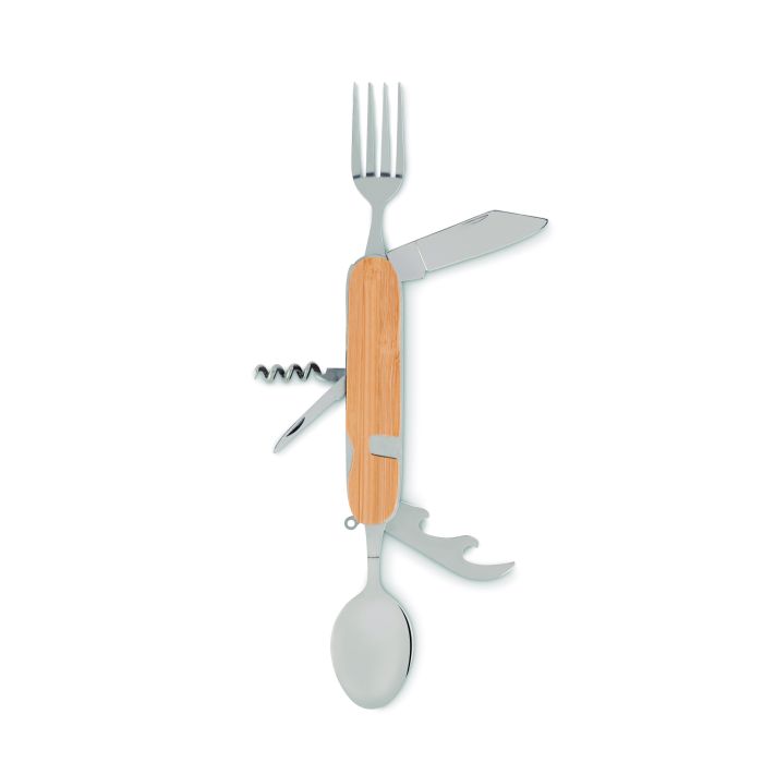 Set de tacâmuri de camping pliabile multifuncționale din metal în carcasă de lemn. 5 funcții. Include furculiță, lingură, desfăcător de conserve, tirbușon și cuțit. Puteți separa piesele în 2.