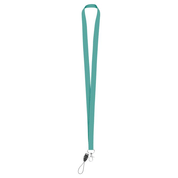 Lanyard din poliester de 15 mm lățime, cu carabină metalică și șnur pentru telefon mobil. Prețul include personalizarea cu sublimare pe ambele fețe. Cantitate minimă de comandă: 100 buc.