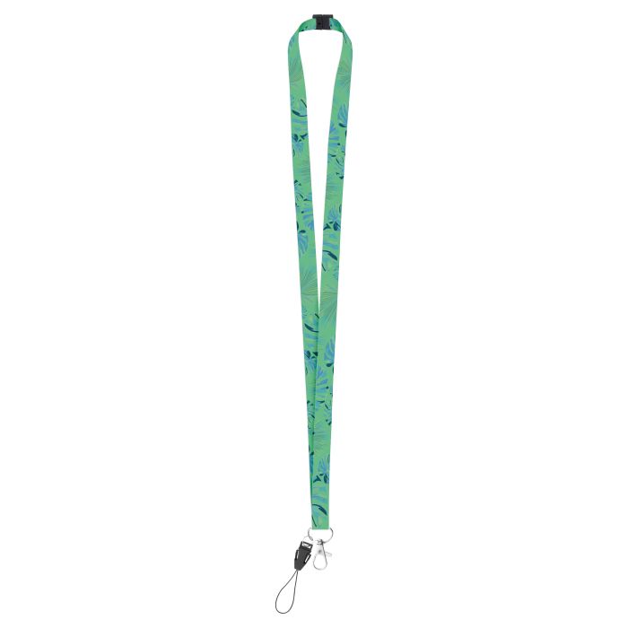 Lanyard din poliester de 15 mm lățime, cu carabină metalică, șnur pentru telefon mobil și cataramă de siguranță. Prețul include personalizarea cu sublimare pe ambele fețe. Cantitate minimă de comandă: 100 buc.