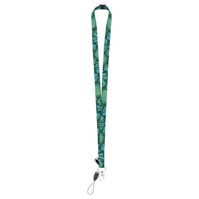 Lanyard de 15 mm latime, din RPET, cu carabina metalica, snur pentru telefon mobil si catarama de siguranta. Pretul include sublimarea pe ambele fete. Cantitate minima de comanda 100 buc.