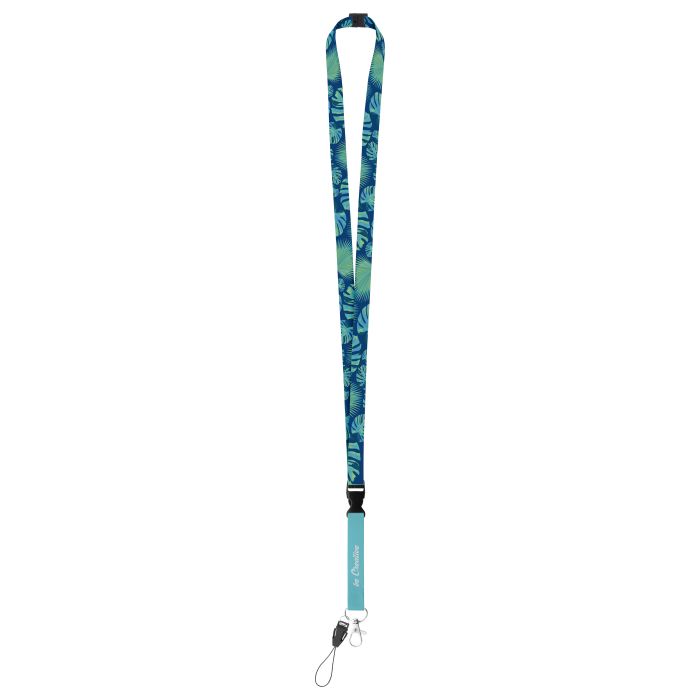 Lanyard din poliester de 15 mm lățime, cu carabină metalică detașabilă, șnur pentru telefon mobil și cataramă de siguranță. Prețul include personalizarea cu sublimare pe ambele fețe. Cantitate minimă de comandă: 100 buc.
