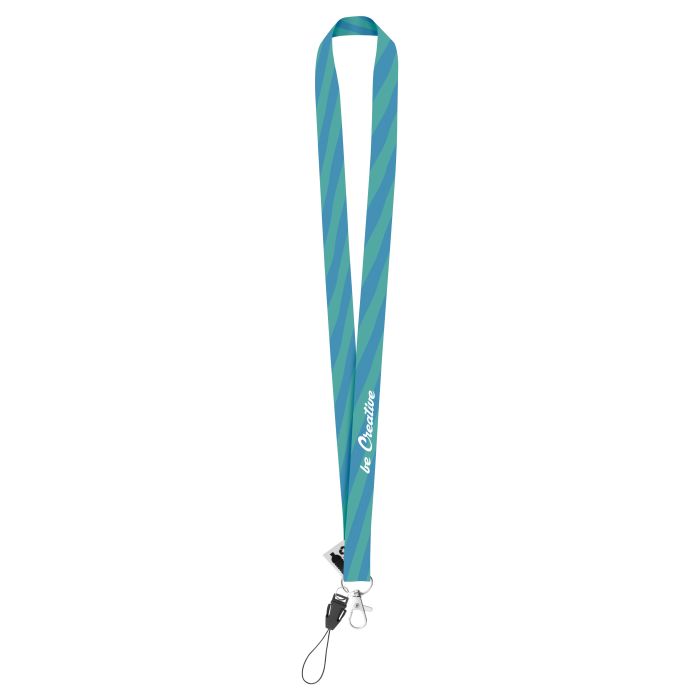 Lanyard din poliester RPET, cu carabina metalica si snur pentru telefon mobil. Pretul include sublimarea pe ambele fete. Cantitate minima de comanda 100 buc.