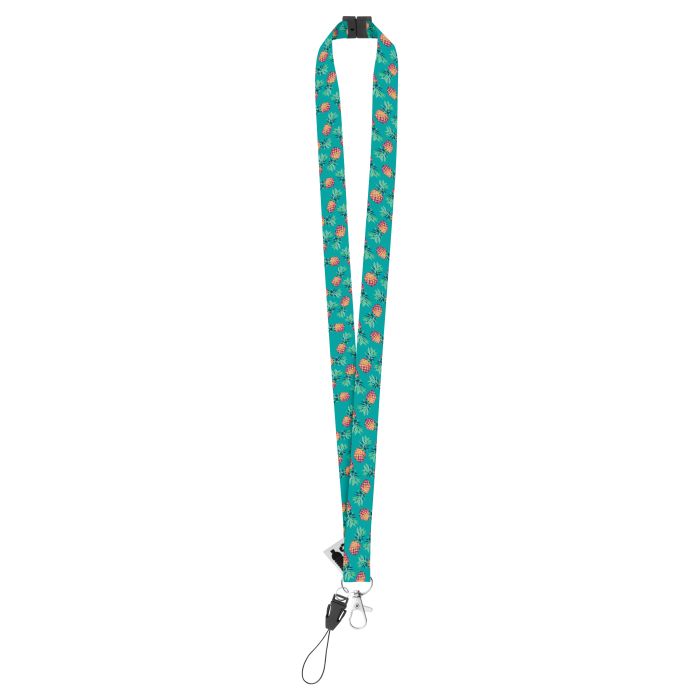 Lanyard din poliester RPET, cu carabina metalica, snur pentru telefon mobil si catarama de siguranta. Pretul include sublimarea pe ambele fete. Cantitate minima de comanda 100 buc.