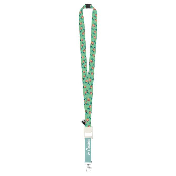 Lanyard personalizat, din poliester RPET, cu carabină metalică, desfăcător sticle si cataramă de siguranță. Pretul include sublimarea pe ambele fețe. Cantitate minimă de comandă 100 buc.