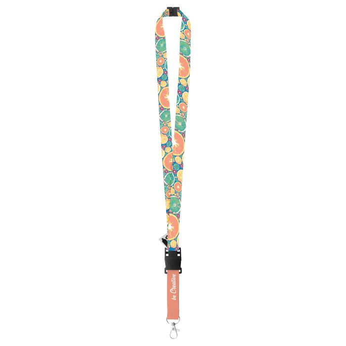 Custom made, RPET lanyard with detachable metal carabiner and safety buckle. With built-in 8 GB USB flash drive inside the plastic buckle. With sublimation printed graphics on both sides. MOQ: 100 pcs. USB 2.0.