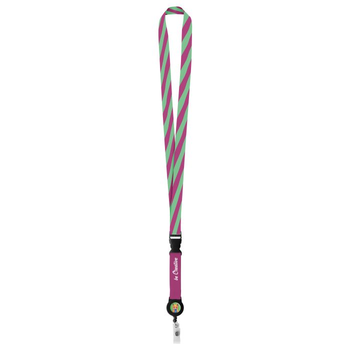 Lanyard din poliester cu suport telescopic detașabil pentru ecuson. Prețul include personalizarea cu sublimare pe ambele fețe. Cantitate minimă de comandă: 100 buc.