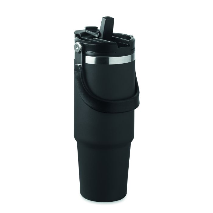Pahar cu dublu perete din oțel inoxidabil reciclat (90% oțel inoxidabil reciclat și 10% oțel inoxidabil) cu capac și pai interior, gură pliabilă și deschidere directă pentru băut. Capacitate 850 ml.