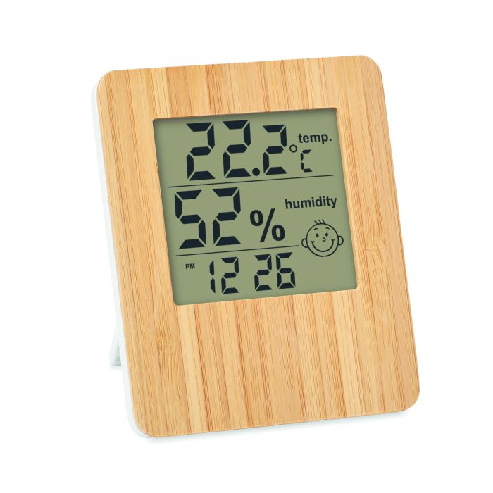 Stație meteo cu partea frontală din bambus și termometru multifuncțional. Include ceas, termometru, afișaj al umidității și funcție de calendar. Funcționează cu 2 baterii AAA (nu sunt incluse). Bambusul este un produs natural, în consecință pot apărea diferențe de culoare, dimensiune sau desen.