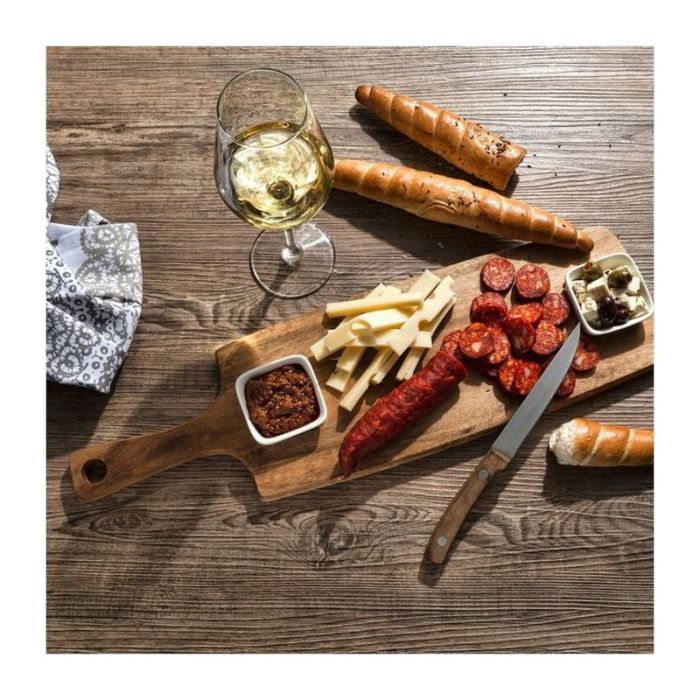 Practical set of serving board which is made of acacia wood and two ceramic bowls for sauces will become a great supplement in your kitchen. Serve different types of cheeses, hams and bread on the board with a sauce or garnish in small bowls