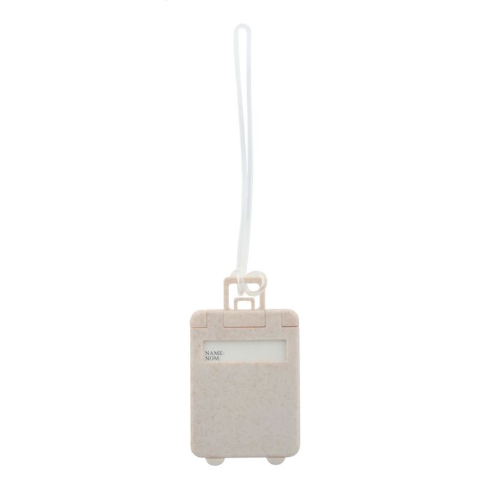 Etichetă ecologică de bagaj, din plastic din paie de grâu, în formă de geantă troler, cu curea elastică.