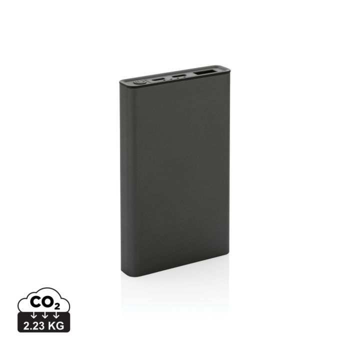 Powerbank made with RCS (Recycled Claim Standard) certified recycled aluminium and ABS. Total recycled content: 36% based on total item weight. RCS certification ensures a completely certified supply chain of the recycled materials. Aluminium does not lose its characteristics in the recycling process and can be recycled endlessly. The powerbank contains a long-lasting grade A 5.000 mAh lithium polymer battery. The power indicators will indicate the remaining energy level so you always know when to re-charge. Item and accessories 100% PVC free. Including type C charging cable made from RCS certified recycled aluminium, TPE and PET. Packed in FSC® mix packaging. USB output 5/2.4A, Type C output: 5V/2.4A. Type C input: 2.4A. Micro USB input: 5V/2A.