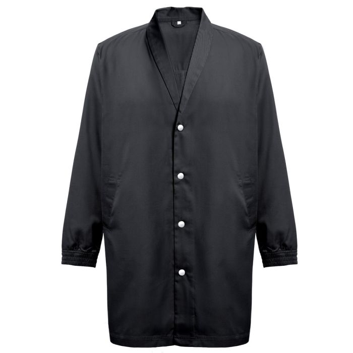 Imbrăcăminte de lucru unisex. 20% bumbac și 80% poliester: 190 g/m². Guler stilizat. Decupaj elegant cu 2 buzunare laterale. Manșete elastice. Se închide cu butoane de blocare. Deschidere pe spate pentru libertate de mișcare. Marimi: S, M, L, XL, XXL, 3XL