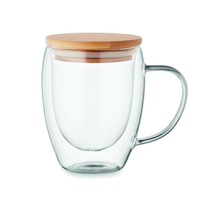 Cană din sticlă borosilicată cu perete dublu, cu mâner și capac din bambus. Capacitate: 250 ml.