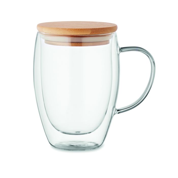 Cană din sticlă borosilicată cu perete dublu, cu mâner și capac din bambus. Capacitate: 350 ml.