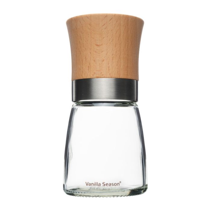 Vanilla Season grinder for pepper, salt or other spices. It is made of glass and bamboo, with a stainless steel accessory. The grinding stones are ceramic and it is possible to adjust the grinding roughness. Packed in a Vanilla Season gift box.