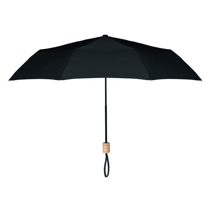 Umbrelă pliabilă de 21 inchi, 3 secțiuni cu material textil 190T RPET pongee, cadru și nervuri placate în negru, cu mâner din lemn. Deschidere și închidere manuală. Husă din materialul propriu.