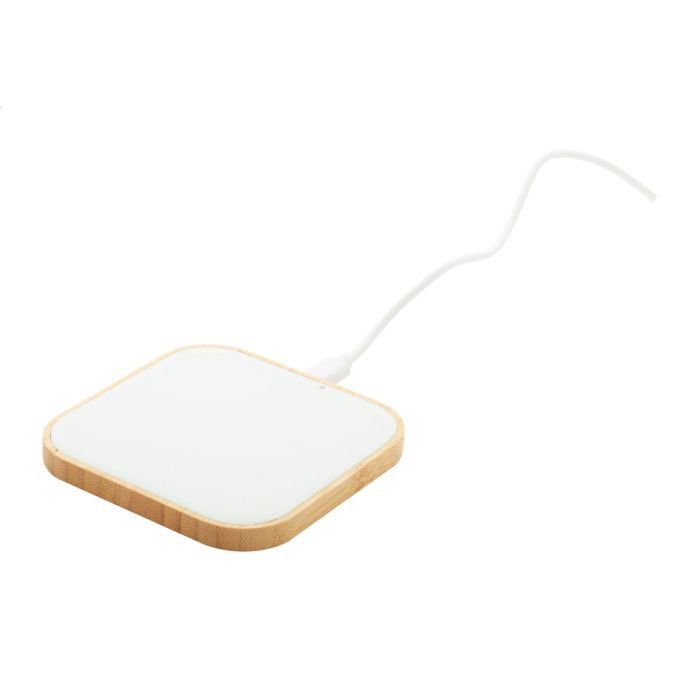 Încărcător rapid, fără fir (10W), în carcasă din bambus, cu suprafață din sticlă securizată. Inclusiv cablu de încărcare USB.