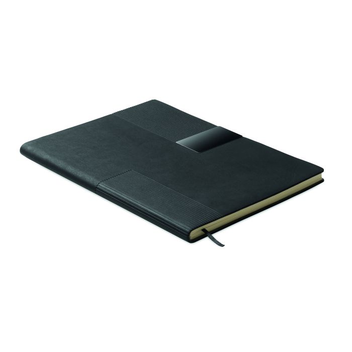 Notebook A5 cu copertă PU moale. Bloc lipit. 160 de pagini liniate din hârtie reciclată (80 de coli). Bandă elastică și semn de carte cu panglică asortate. Detaliu din fier metalic pe față.