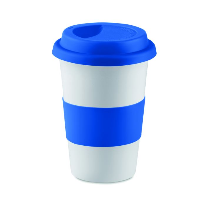 Cană ceramică cu perete simplu, capac și manșon din silicon. Capacitate 400ml. Transferul ceramic rezistă în mașini de spălat vase. Fiind o cană cu perete simplu transfer de căldură e posibil.