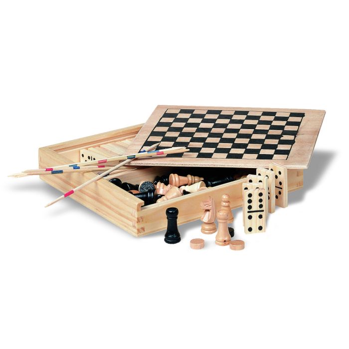 4 jocuri în cutie din lemn: domino, șah, joc de cărți și bețe din lemn pentru maroco.