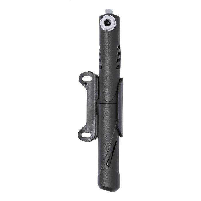 Mini pompă manuală pentru bicicletă, cu suport montat pe cadru.