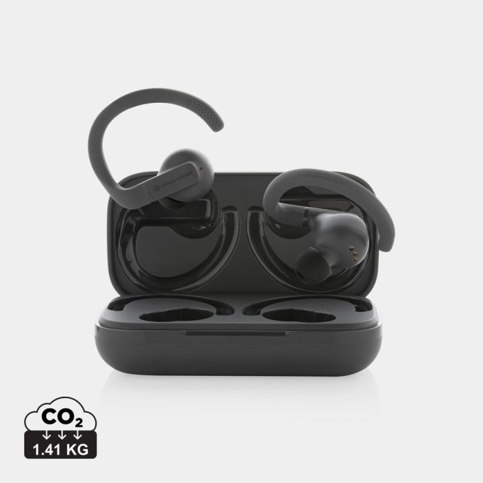 Outperform yourself and take your fitness to the next level with these perfect fit work out earbuds. The customisable, perfect fit ear hooks are adjustable with multiple ear tip options for extended comfort, and are made to stay in place, no matter how intense your workout is. These lightweight earbuds are built for peak performance with a sturdy design for IPX5-rated sweat, dust and water resistance. With up to 8 hours hours of listening time due to advanced BT 5.3 in each earbud and powerful, balanced sound, you’ll always have your music to motivate you. The earbuds and 600 mah charging case are made with made with RCS (Recycled Claim Standard) certified recycled ABS/TPE. Total recycled content: 55 % based on total item weight. RCS certification ensures a completely certified supply chain of the recycled materials. The earbuds can be re-charged 3 times fully in the charging case. Urban Vitamin items are made without PVC and packed in in plastic reduced packaging.