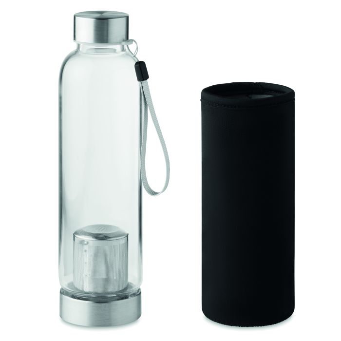 Sticlă de băut, cu perete simplu din borosolicat, cu strecurător pentru ceai și husă din neopren. Capacitate: 500 ml. Nu este recomandată pentru băuturile carbogazoase. Fără scurgere. Gravarea cu laser nu este posibilă pe sticla borosilicată.