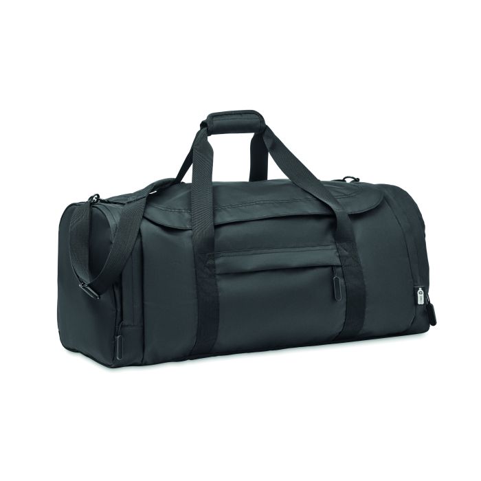 Geantă mare sport sau de călătorie din poliester RPET 300D. Compartiment principal cu fermoar lateral pentru răcire și compartimente pentru diverse obiecte. Parte inferioară cu întăritură detașabilă și curea de umăr reglabilă și detașabilă.
