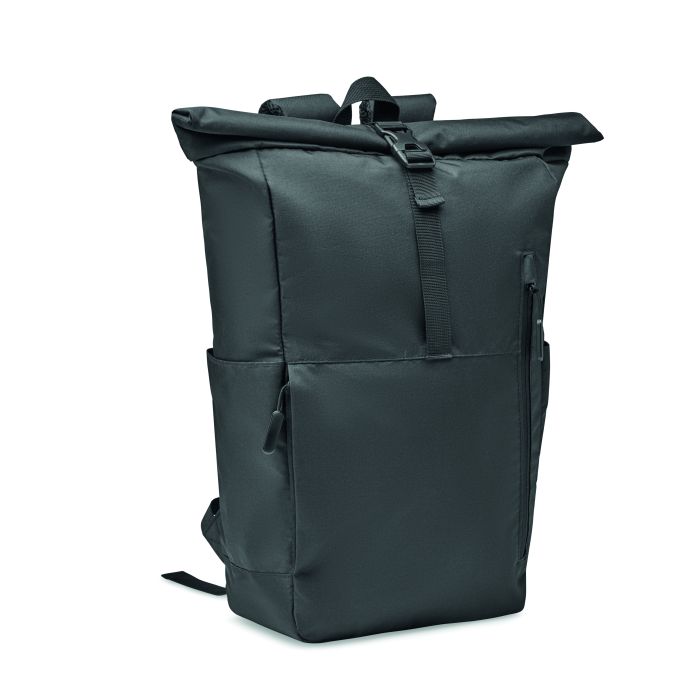 Rucsac pentru laptop de 15 inch cu rolă, din poliester RPET 300D. Buzunar frontal mare cu fermoar și buzunar mic cu carabină în interior.