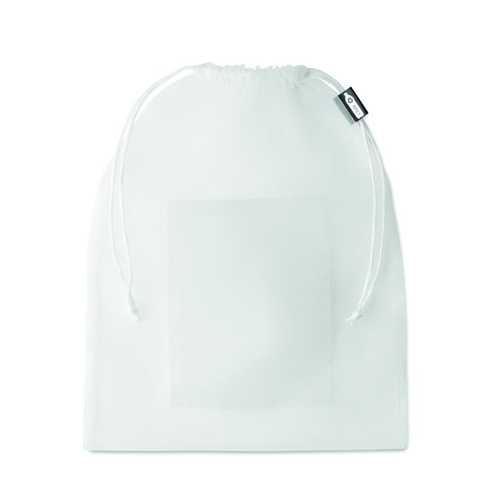 Pungă pentru mâncare din plasă RPET, cu buzunar frontal și cordon PP alb.