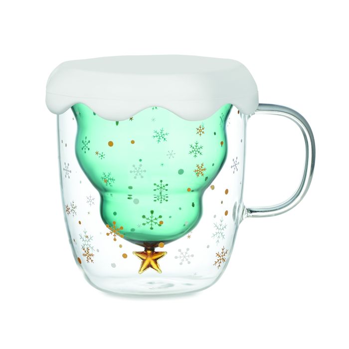 Cană din borosilicat cu perete dublu, cu design de sezon. Capac și suport de pahar din silicon. Capacitate: 250 ml.