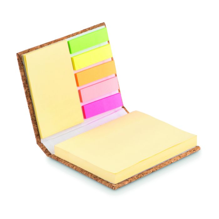 Set de blocnotes autocolante din 3 piese cu copertă din plută tare. Blocnotes autocolant galben cu 50 de file mari și 25 de file medii din hârtie reciclată și 5 markere de pagină de culori diferite.