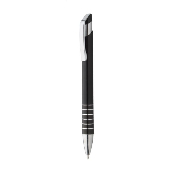 Pix din plastic cu vârf şi clip metalic, dispozitiv de prindere din aluminiu. Mină albastră.