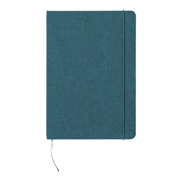 Caiet cu coperta din poliester 300D RPET, cu 80 de foi veline. Cu curea de cauciuc de culoare similară, marcaj și suport pentru pix. Dimensiune A5.