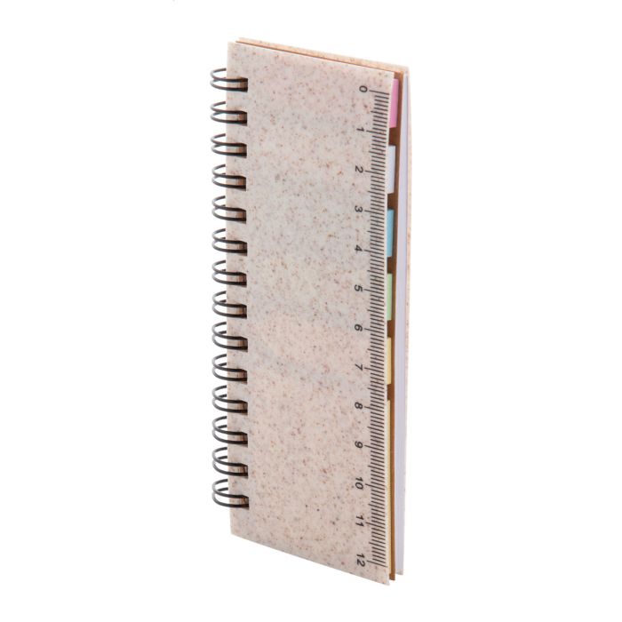 Caiet ecologic, cu spirală, cu coperta din plastic din paie de grâu, cu 40 de foi dictando, din hârtie reciclată, 25 de note adezive și 25 de markere de pagină (în 5 culori diferite). Cu riglă de 12 cm pe copertă.