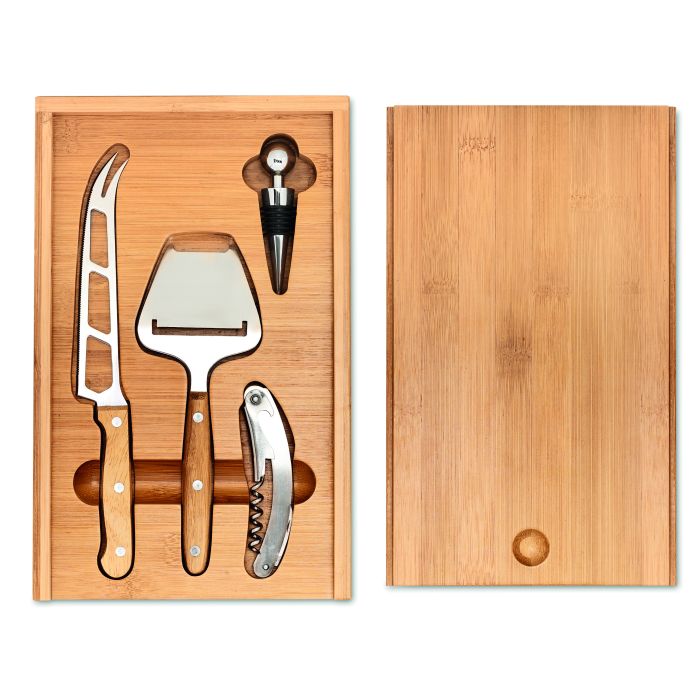 Set din bambus pentru vin și brânzeturi. Include cuțit din inox, cuțit de brânzeturi, tirbușon și dop pentru sticlă. Ambalate în cutie din bambus. Bambusul este un produs natural, în consecință pot apărea diferențe de culoare, dimensiune sau desen.