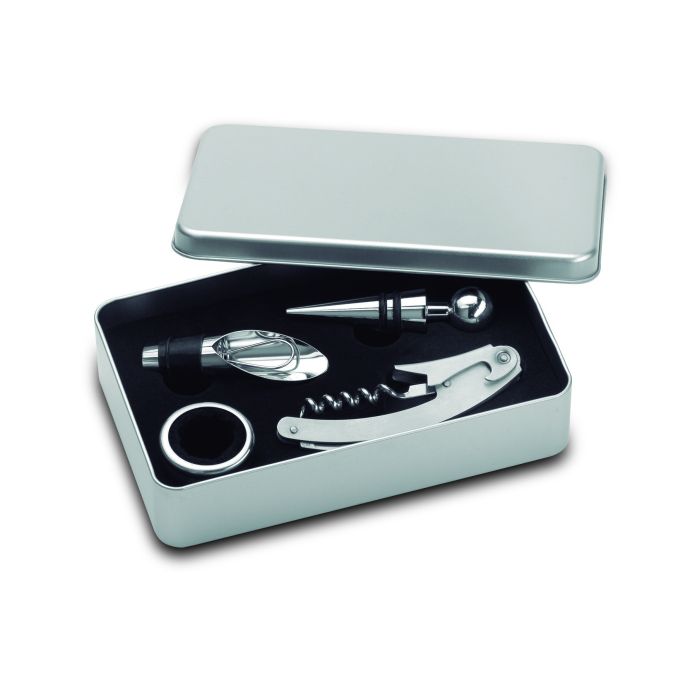 Set vin cu tirbușon, dop, picurător şi manșon, prezentate într-o cutie metalică.