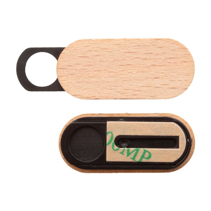 Blocker pentru camera web cu invelis din lemn, capac glisant si spate cu adeziv.