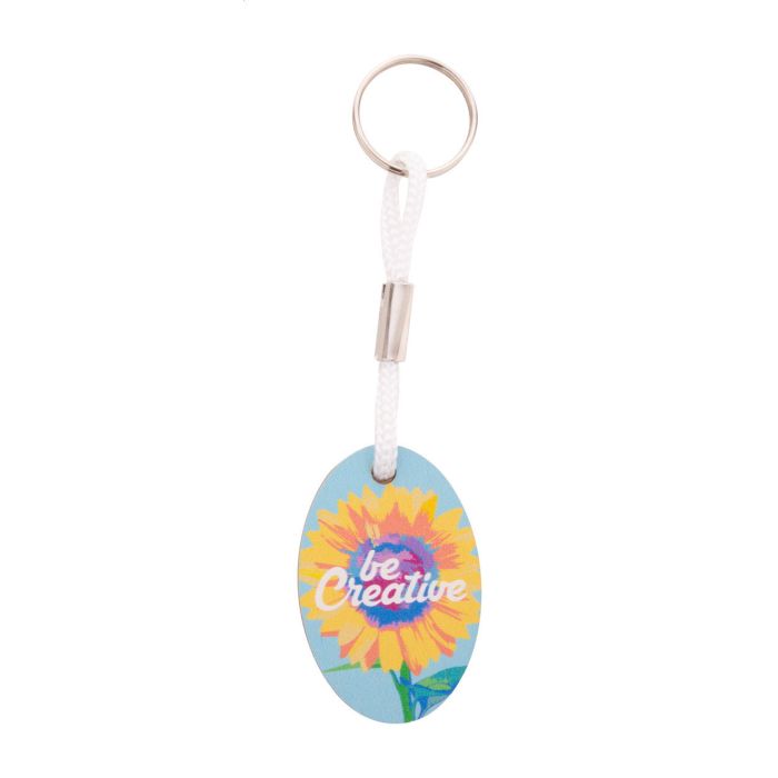 Breloc din placaj de mesteacăn, în formă ovală, cu șnur de poliester colorat și imprimare color. Prețul include imprimarea UV LED pe o parte. MOQ: 200 buc.