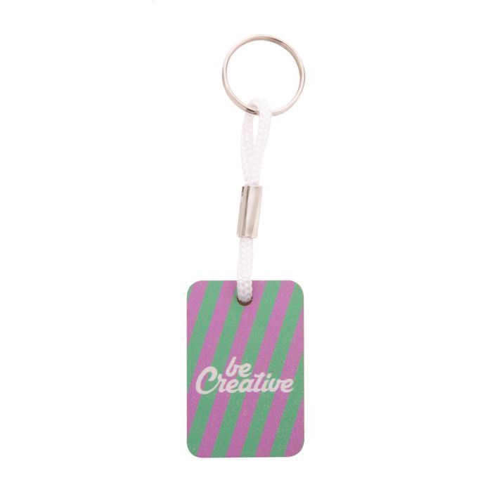 Breloc din placaj de mesteacăn, în formă dreptunghiulară, cu șnur de poliester colorat și imprimare color. Prețul include imprimarea UV LED pe o parte. MOQ: 200 buc.
