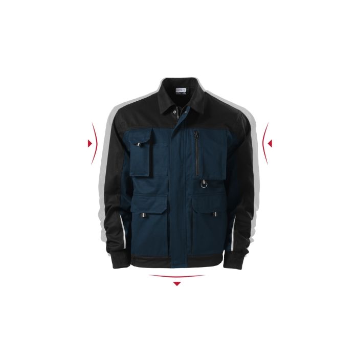 fermoar modelat pe toată lungimea cu clapă, falduri pe spate, 8 buzunare multifuncționale, buzunare cu clapă în partea de jos și buzunare cu fermoar și bordură, manșetele sunt din material raiat cu 3 % adaos de elastan, tivul din partea inferioară prezintă bandă elastică, inel D din plastic și cârlig pentru chei și CI, cusătură dublă pentru rezistență ridicată, elemente reflectorizante
