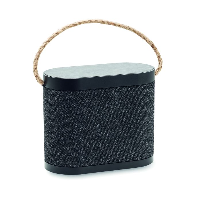 Boxă wireless 5.3 din ABS cu finisaj din țesătură poliester RPET și încărcător wireless 15W din bambus în partea superioară, cu mâner din iută. 1 baterie reîncărcabilă Li-Ion 1200 mAh. Date de ieșire: 5W, 4 Ohm și 5V. Timp de redare aprox. 4h.