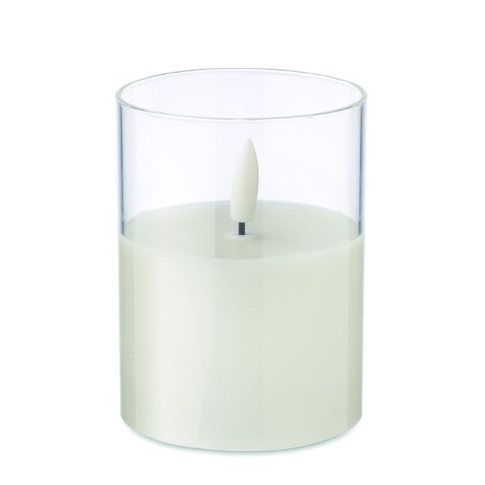 Lumânare de ceară cu LED-uri și efect de flacără reală în suport de sticlă. Funcționeaza cu 2 baterii AA care nu sunt incluse.