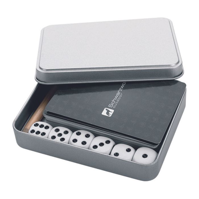 Schwarzwolf travel set of a playing card and a dice in a tin box. You will certainly welcome this set, for example during your camping trip, when you and your friends will be able to enjoy the evening with a fun game or just at home with your family. The set includes 54 playing cards with a water repellent surface treatment, 6 dice, 15 note papers and a pencil. Packed in a gift box.