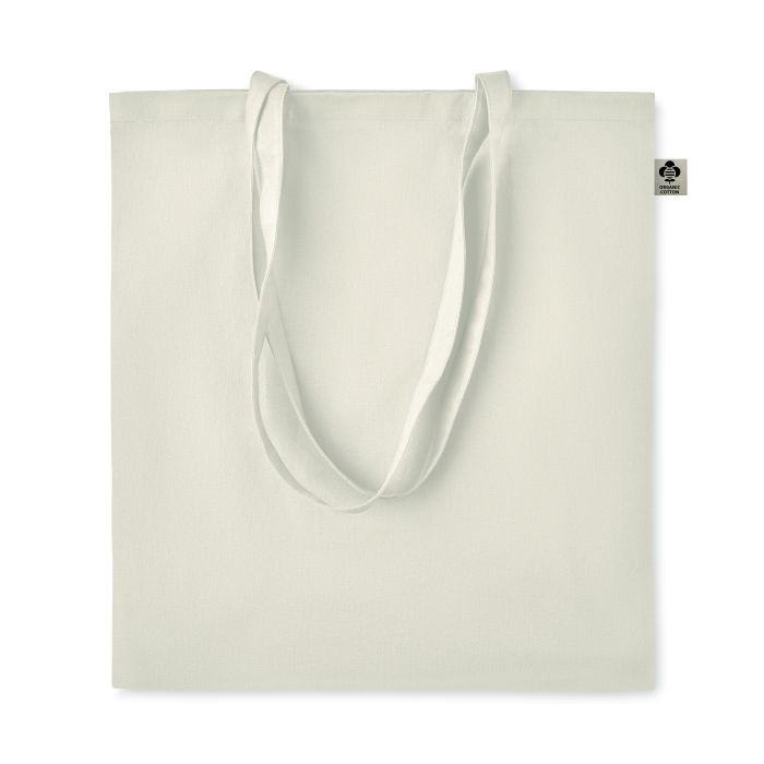 Sacoșă de cumpărături din bumbac organic, cu mânere lungi. Un design clasic de sacoșă de mână realizat pentru a transporta produsele alimentare zilnice sau alte obiecte. Cu mânerele lungi duceți geanta în mână sau pe umăr. Fabricată din bumbac organic 100% natural 140 gr / m². Acest produs este certificat OEKO-TEX® STANDARD 100.