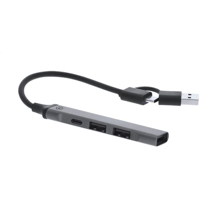 Hub USB din aluminiu reciclat, cu 3 porturi USB (USB 2.0) și 1 USB-C (USB 3.0). Inclusiv cablu cu conexiuni USB și USB-C